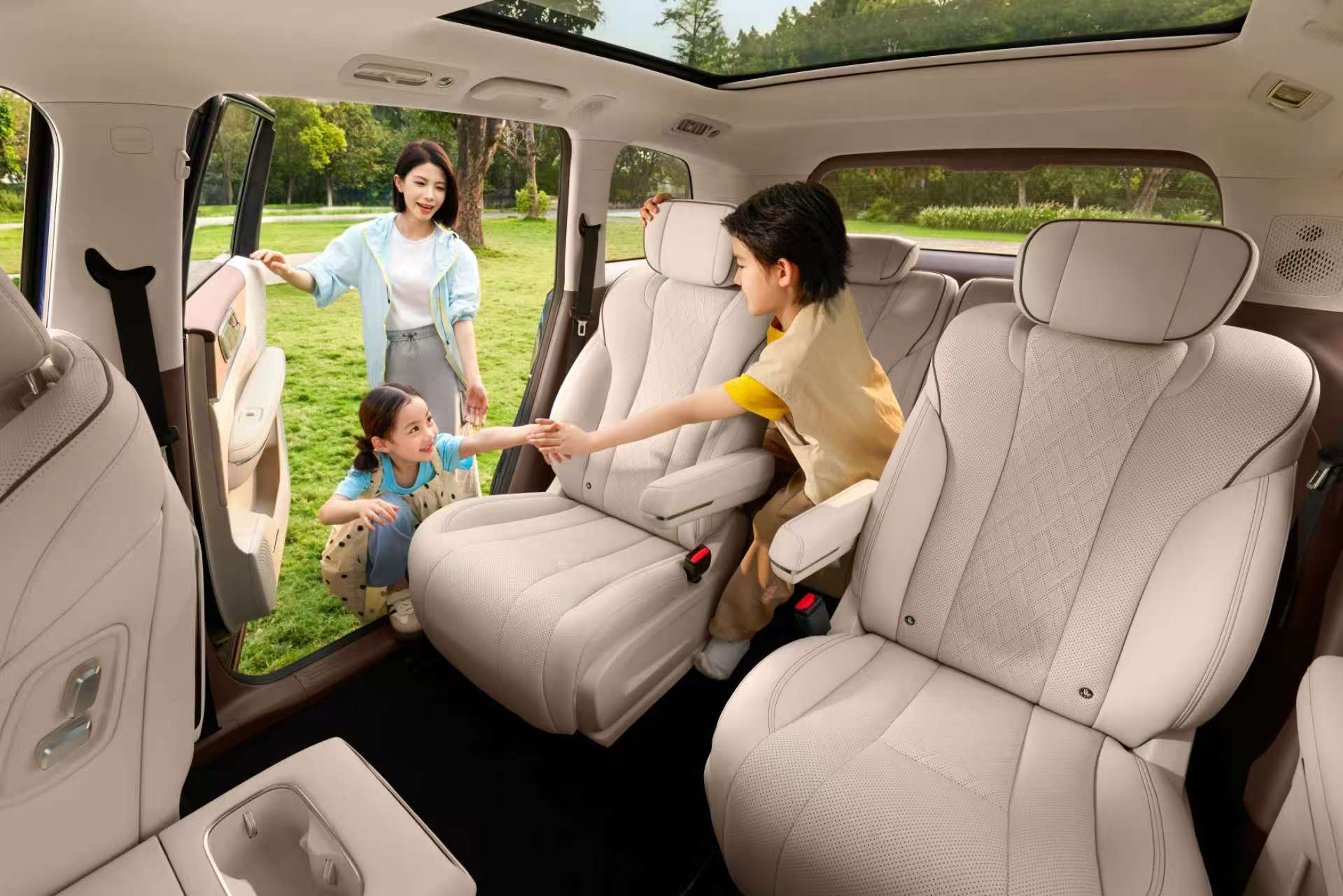 空間表現(xiàn)是星光L的核心優(yōu)勢之一。憑借2950毫米的超長軸距,其“得房率”高達(dá)90%。二排、三排地板采用純平設(shè)計,配合1.24米的同級最高層高與190毫米的過道寬度,乘客進(jìn)出二三排更加從容,完全不會感到壓抑。第二排為獨立座椅,支持電動調(diào)節(jié)、通風(fēng)、加熱和按摩功能,并配備電動腿托與小桌板,乘坐舒適性堪比商務(wù)艙。其后備箱采用雙層下沉式設(shè)計,容積遠(yuǎn)超同級車型,且內(nèi)部規(guī)整,可輕松滿足家庭出行需求。車內(nèi)還設(shè)有40處儲物空間,可有序收納嬰兒奶瓶、兒童玩具、雨傘等物品,讓車內(nèi)環(huán)境更加整潔。